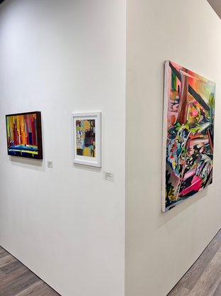 Color as Space, Modes of Abstraction is a group exhibition featuring the work of Louisville based artists, Rita Cameron, Julia Coash, Alana Fitzgerald, and Catherine Rubin. These four artists are engaged in compelling color relationships, and describe space and formal relationships like shape, form and movement in magnetic ways. There is a breadth of media used within this exhibition, such as collage, painting, paper weaving, and digital methods creating dynamic energy on each surface.